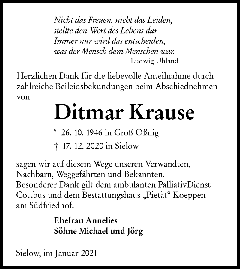 Hier finden Sie alle Traueranzeigen aus der Zeitung, die bisher für Ditmar Krause erschienen sind. Weitere Traueranzeigen, die in der Zeitung erscheinen, werden hier ebenfalls aufgelistet