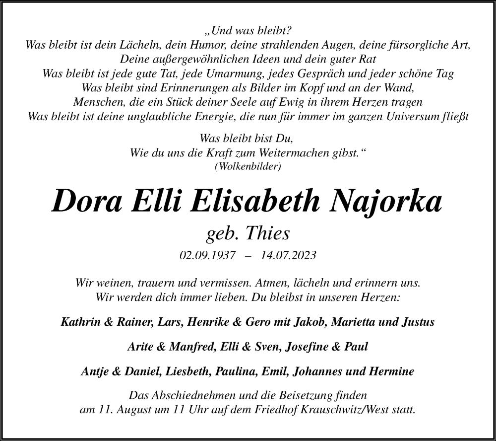 Hier finden Sie alle Traueranzeigen aus der Zeitung, die bisher für Dora Elli Elisabeth Najorka erschienen sind. Weitere Traueranzeigen, die in der Zeitung erscheinen, werden hier ebenfalls aufgelistet