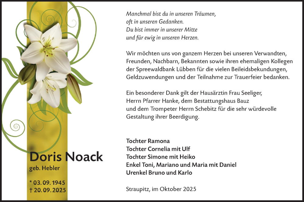 Hier finden Sie alle Traueranzeigen aus der Zeitung, die bisher für Doris Noack erschienen sind. Weitere Traueranzeigen, die in der Zeitung erscheinen, werden hier ebenfalls aufgelistet