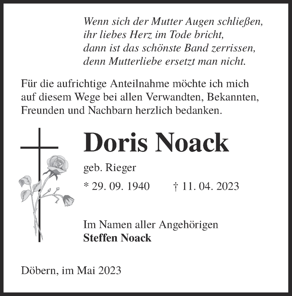 Hier finden Sie alle Traueranzeigen aus der Zeitung, die bisher für Doris Noack erschienen sind. Weitere Traueranzeigen, die in der Zeitung erscheinen, werden hier ebenfalls aufgelistet