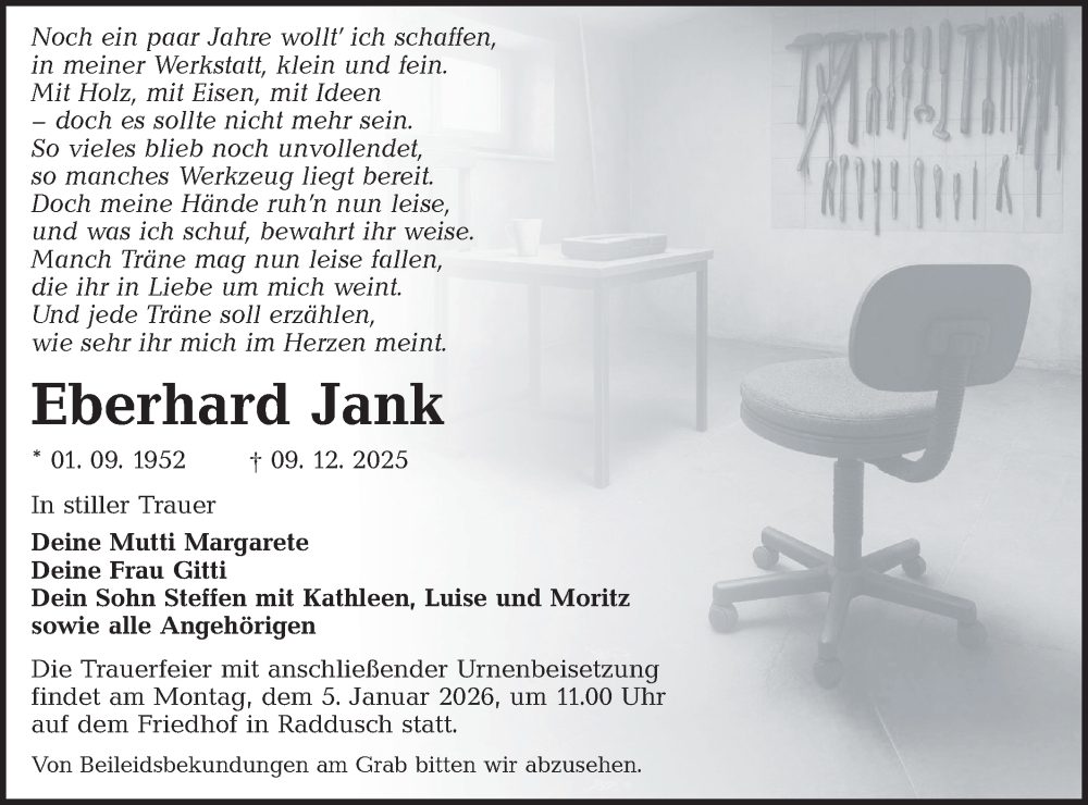 Hier finden Sie alle Traueranzeigen aus der Zeitung, die bisher für Eberhard Jank erschienen sind. Weitere Traueranzeigen, die in der Zeitung erscheinen, werden hier ebenfalls aufgelistet