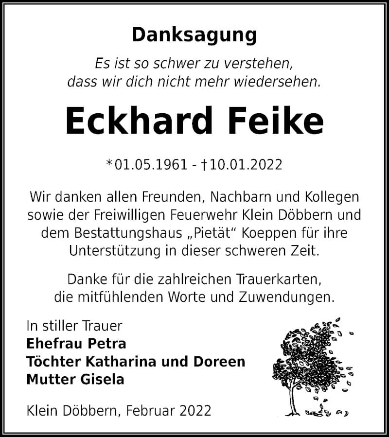 Hier finden Sie alle Traueranzeigen aus der Zeitung, die bisher für Eckhard Feike erschienen sind. Weitere Traueranzeigen, die in der Zeitung erscheinen, werden hier ebenfalls aufgelistet