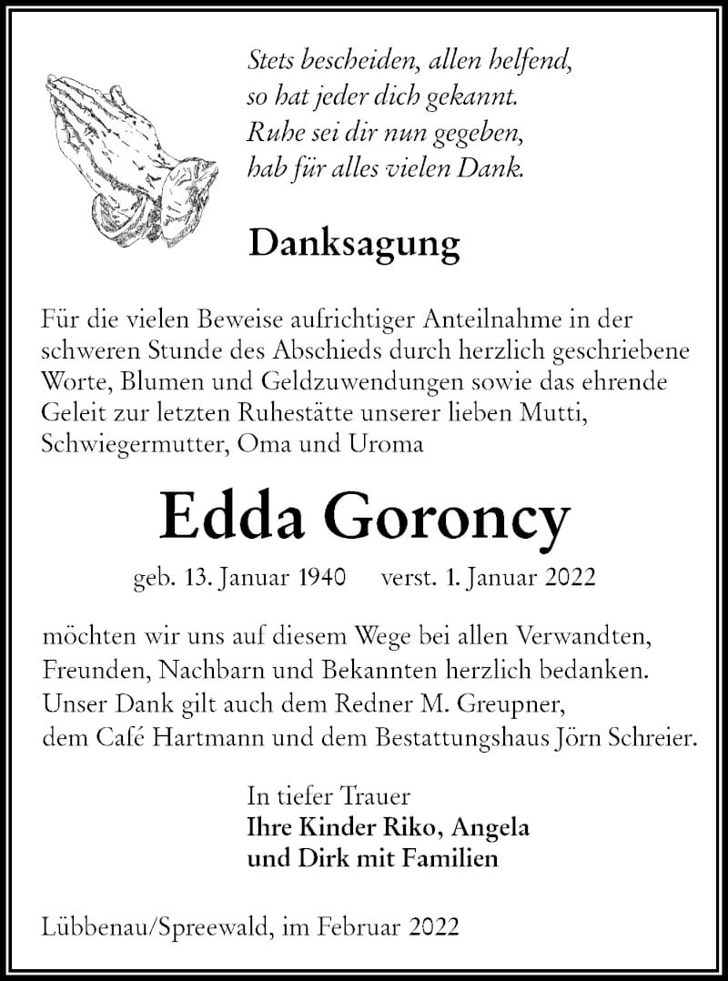 Hier finden Sie alle Traueranzeigen aus der Zeitung, die bisher für Edda Goroncy erschienen sind. Weitere Traueranzeigen, die in der Zeitung erscheinen, werden hier ebenfalls aufgelistet