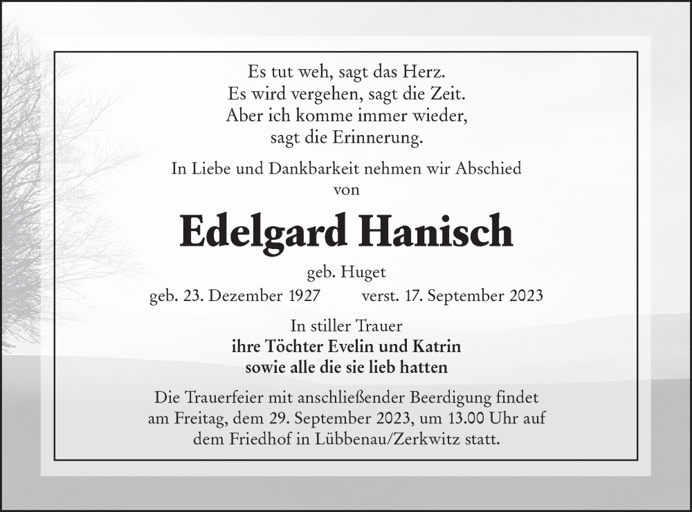 Hier finden Sie alle Traueranzeigen aus der Zeitung, die bisher für Edelgard Hanisch erschienen sind. Weitere Traueranzeigen, die in der Zeitung erscheinen, werden hier ebenfalls aufgelistet