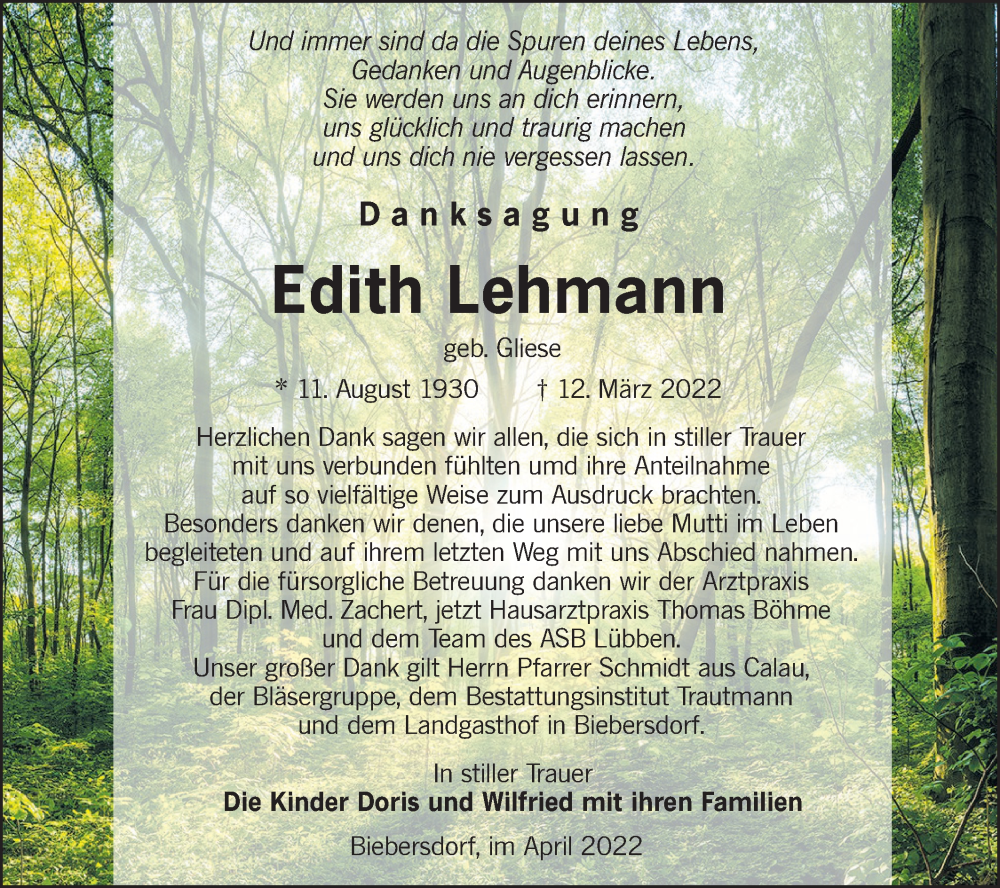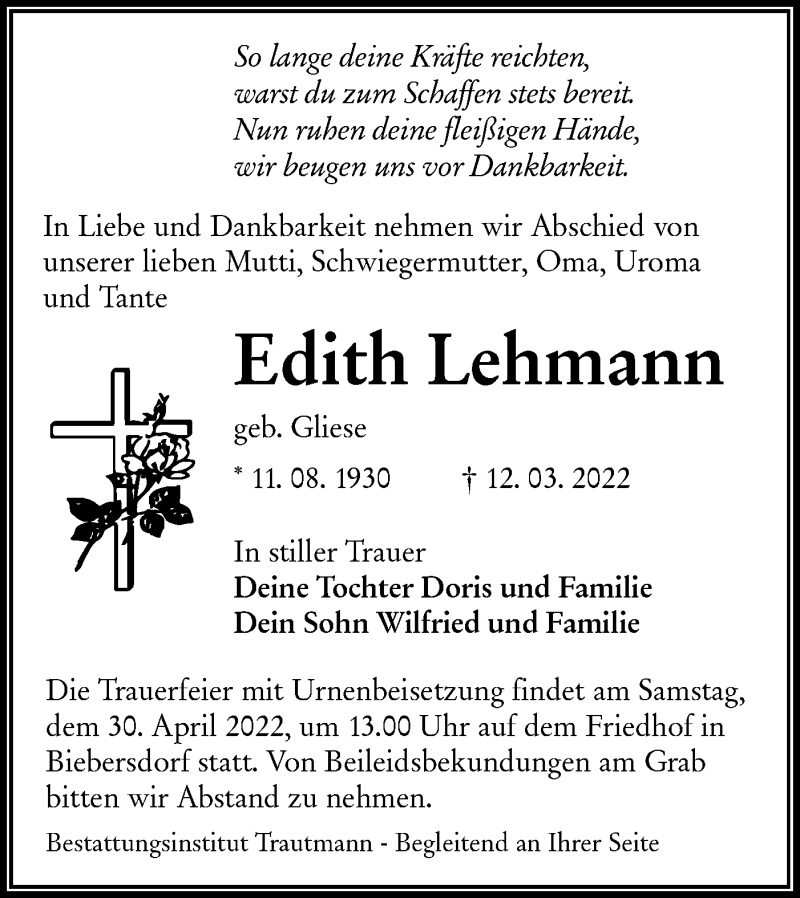 Hier finden Sie alle Traueranzeigen aus der Zeitung, die bisher für Edith Lehmann erschienen sind. Weitere Traueranzeigen, die in der Zeitung erscheinen, werden hier ebenfalls aufgelistet