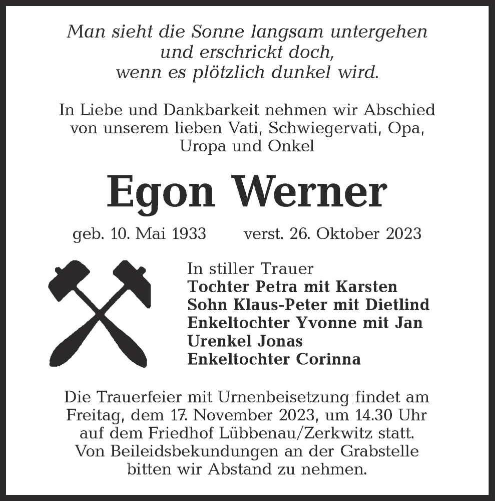 Hier finden Sie alle Traueranzeigen aus der Zeitung, die bisher für Egon Werner erschienen sind. Weitere Traueranzeigen, die in der Zeitung erscheinen, werden hier ebenfalls aufgelistet