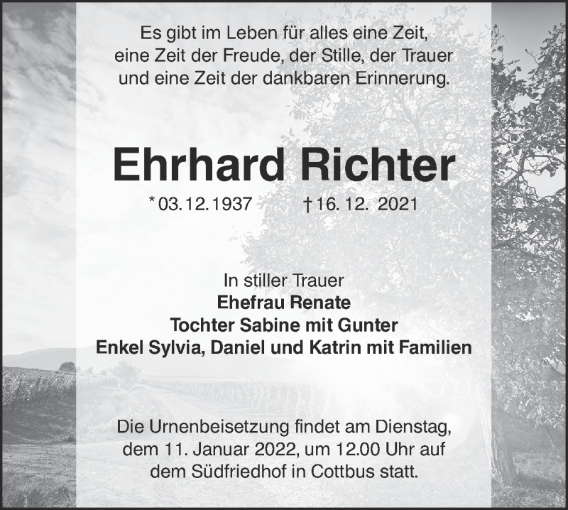 Hier finden Sie alle Traueranzeigen aus der Zeitung, die bisher für Ehrhard Richter erschienen sind. Weitere Traueranzeigen, die in der Zeitung erscheinen, werden hier ebenfalls aufgelistet