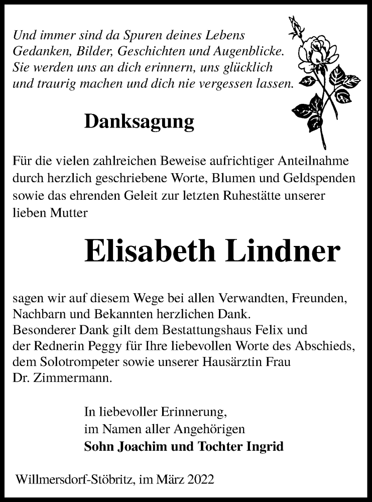 Hier finden Sie alle Traueranzeigen aus der Zeitung, die bisher für Elisabeth Lindner erschienen sind. Weitere Traueranzeigen, die in der Zeitung erscheinen, werden hier ebenfalls aufgelistet