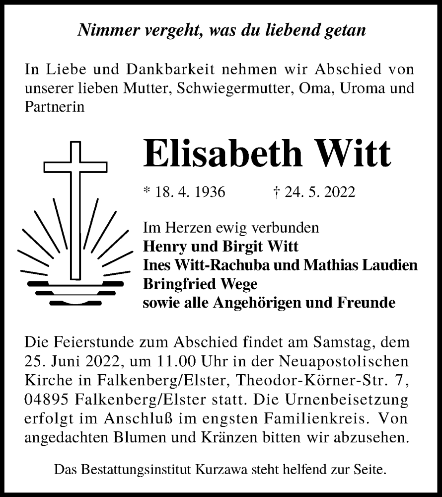 Hier finden Sie alle Traueranzeigen aus der Zeitung, die bisher für Elisabeth Witt erschienen sind. Weitere Traueranzeigen, die in der Zeitung erscheinen, werden hier ebenfalls aufgelistet