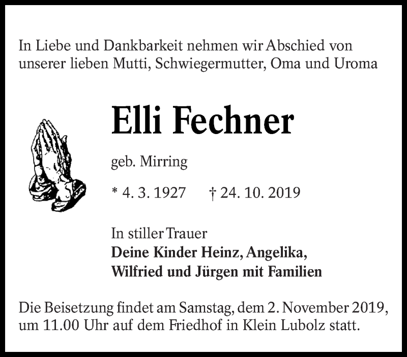 Hier finden Sie alle Traueranzeigen aus der Zeitung, die bisher für Elli Fechner erschienen sind. Weitere Traueranzeigen, die in der Zeitung erscheinen, werden hier ebenfalls aufgelistet