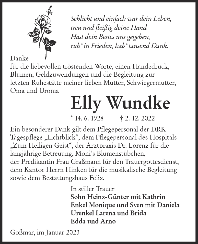 Hier finden Sie alle Traueranzeigen aus der Zeitung, die bisher für Elly Wundke erschienen sind. Weitere Traueranzeigen, die in der Zeitung erscheinen, werden hier ebenfalls aufgelistet