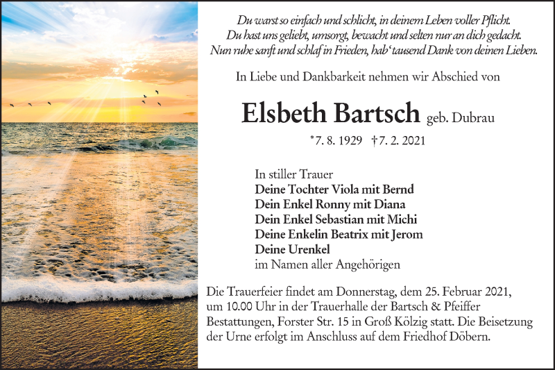 Hier finden Sie alle Traueranzeigen aus der Zeitung, die bisher für Elsbeth Bartsch erschienen sind. Weitere Traueranzeigen, die in der Zeitung erscheinen, werden hier ebenfalls aufgelistet