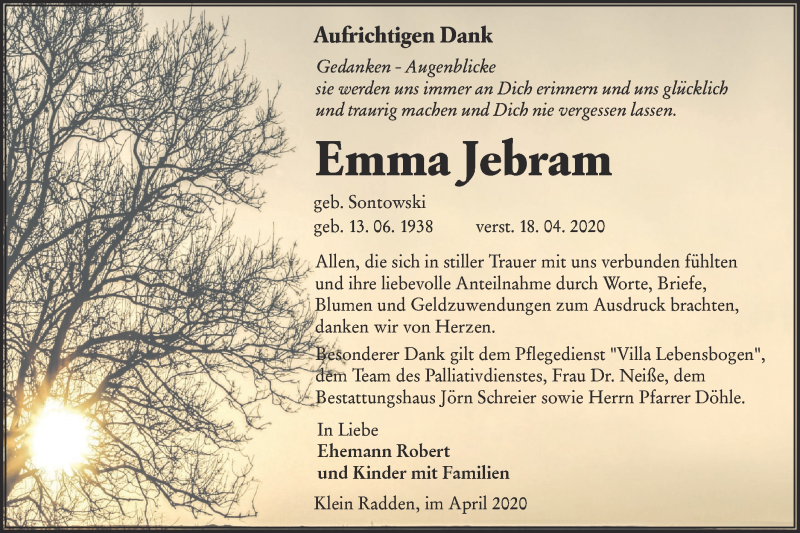 Hier finden Sie alle Traueranzeigen aus der Zeitung, die bisher für Emma Jebram erschienen sind. Weitere Traueranzeigen, die in der Zeitung erscheinen, werden hier ebenfalls aufgelistet