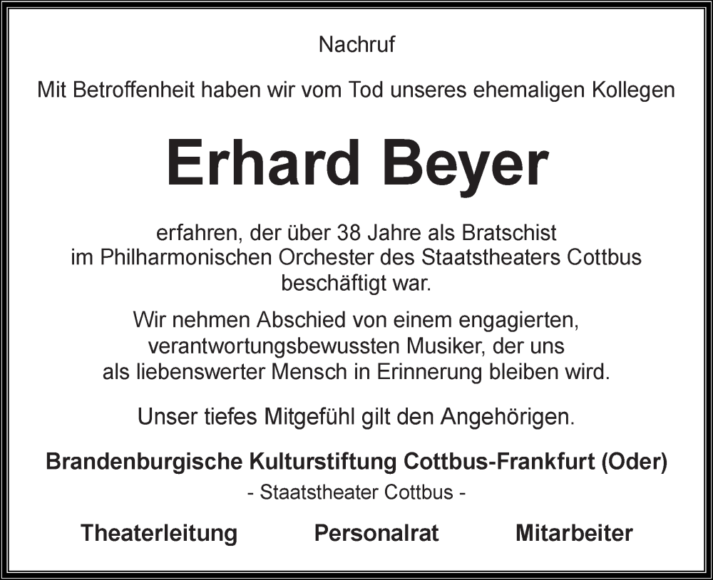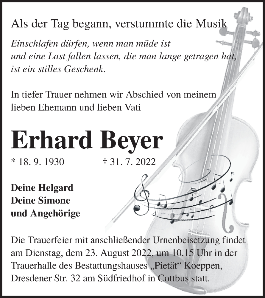 Hier finden Sie alle Traueranzeigen aus der Zeitung, die bisher für Erhard Beyer erschienen sind. Weitere Traueranzeigen, die in der Zeitung erscheinen, werden hier ebenfalls aufgelistet