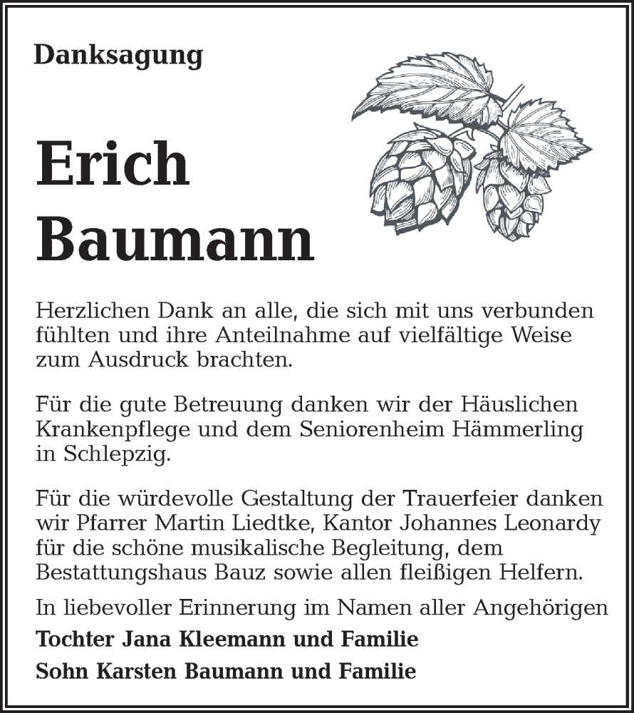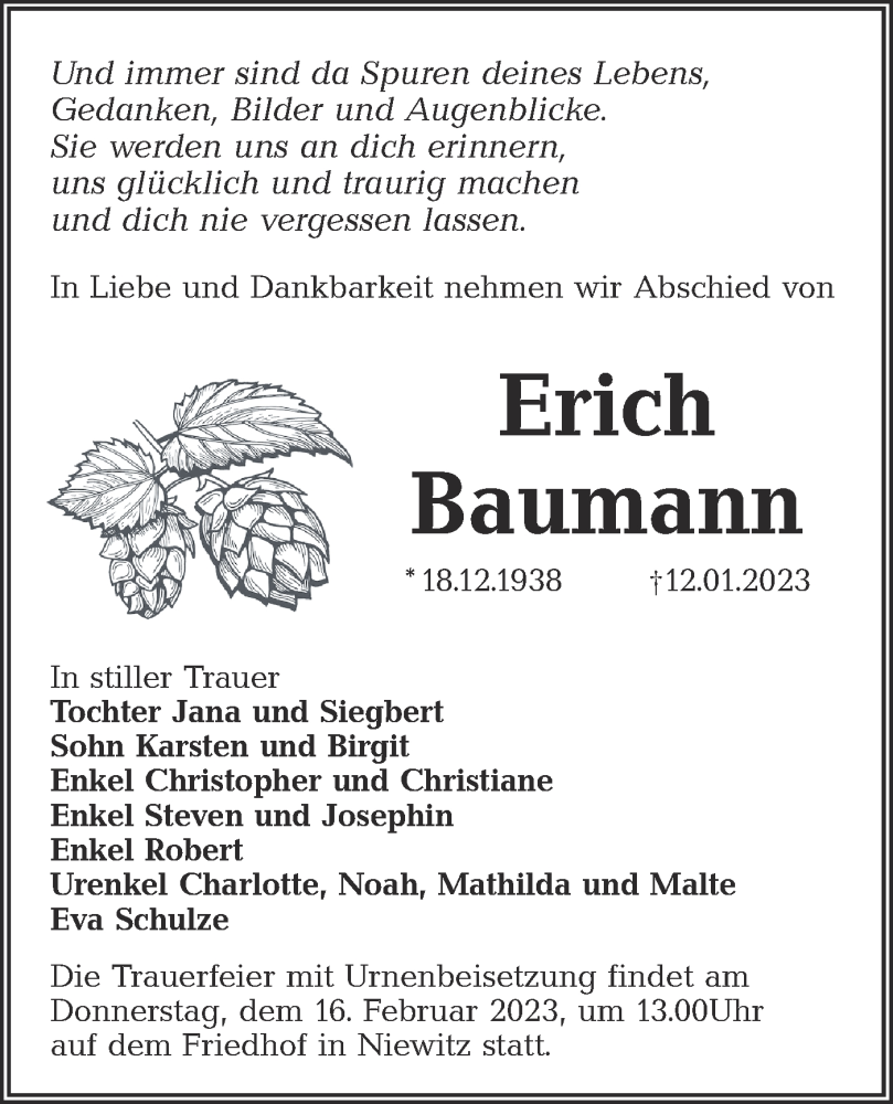 Hier finden Sie alle Traueranzeigen aus der Zeitung, die bisher für Erich Baumann erschienen sind. Weitere Traueranzeigen, die in der Zeitung erscheinen, werden hier ebenfalls aufgelistet