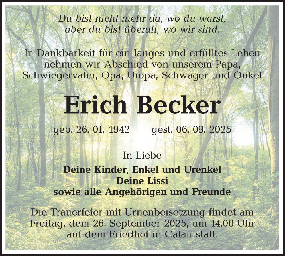 Hier finden Sie alle Traueranzeigen aus der Zeitung, die bisher für Erich Becker erschienen sind. Weitere Traueranzeigen, die in der Zeitung erscheinen, werden hier ebenfalls aufgelistet