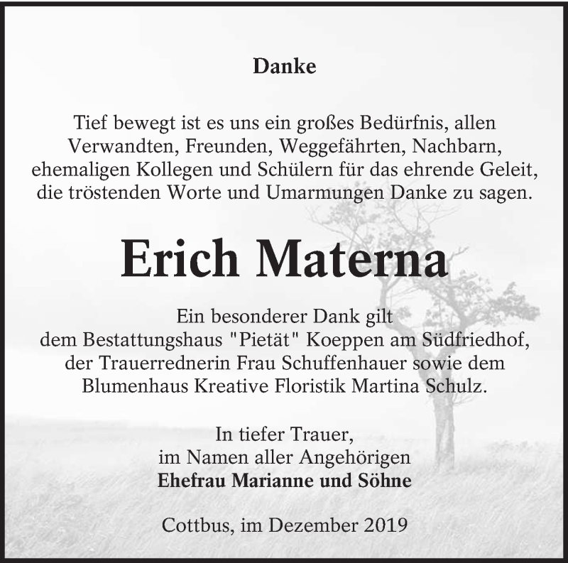 Hier finden Sie alle Traueranzeigen aus der Zeitung, die bisher für Erich Materna erschienen sind. Weitere Traueranzeigen, die in der Zeitung erscheinen, werden hier ebenfalls aufgelistet