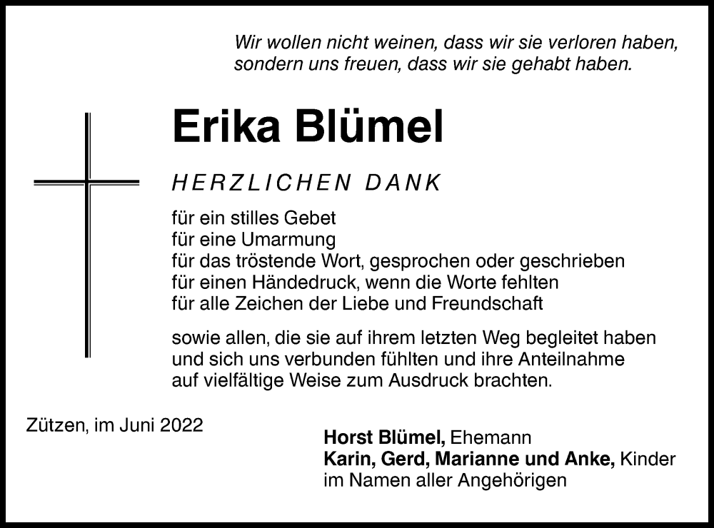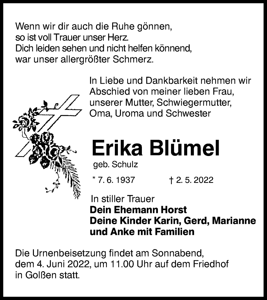 Hier finden Sie alle Traueranzeigen aus der Zeitung, die bisher für Erika Blümel erschienen sind. Weitere Traueranzeigen, die in der Zeitung erscheinen, werden hier ebenfalls aufgelistet