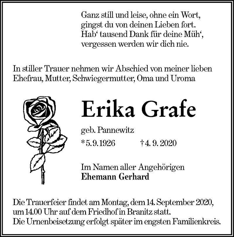 Hier finden Sie alle Traueranzeigen aus der Zeitung, die bisher für Erika Grafe erschienen sind. Weitere Traueranzeigen, die in der Zeitung erscheinen, werden hier ebenfalls aufgelistet