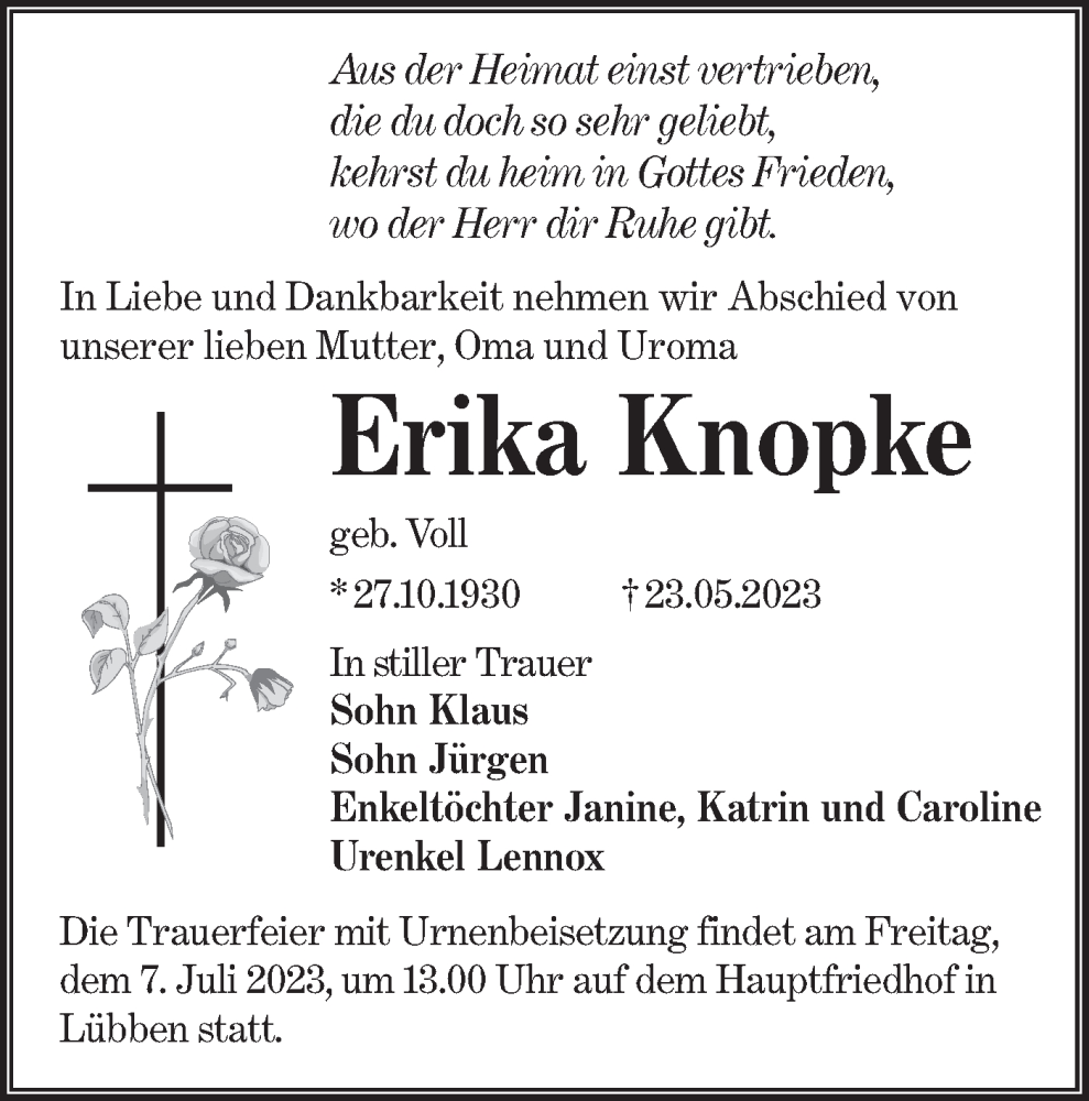 Hier finden Sie alle Traueranzeigen aus der Zeitung, die bisher für Erika Knopke erschienen sind. Weitere Traueranzeigen, die in der Zeitung erscheinen, werden hier ebenfalls aufgelistet