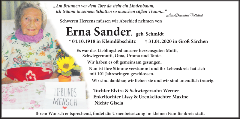 Hier finden Sie alle Traueranzeigen aus der Zeitung, die bisher für Erna Sander erschienen sind. Weitere Traueranzeigen, die in der Zeitung erscheinen, werden hier ebenfalls aufgelistet