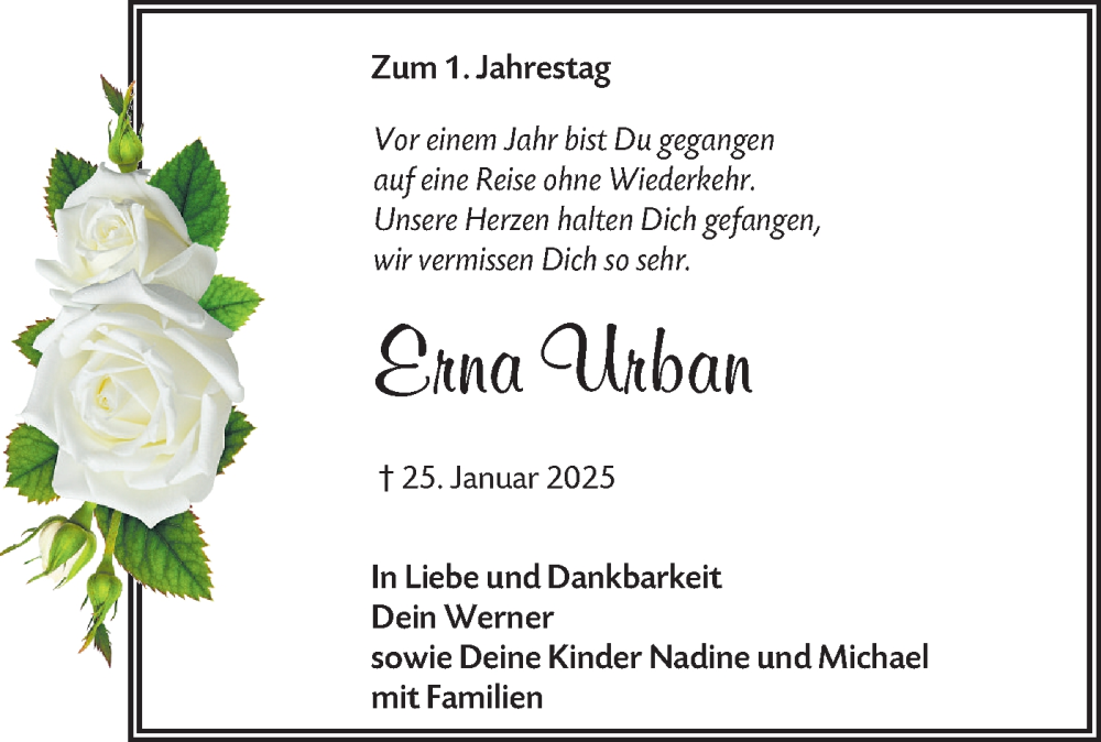 Hier finden Sie alle Traueranzeigen aus der Zeitung, die bisher für Erna Urban erschienen sind. Weitere Traueranzeigen, die in der Zeitung erscheinen, werden hier ebenfalls aufgelistet