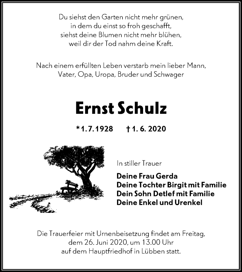 Hier finden Sie alle Traueranzeigen aus der Zeitung, die bisher für Ernst Schulz erschienen sind. Weitere Traueranzeigen, die in der Zeitung erscheinen, werden hier ebenfalls aufgelistet