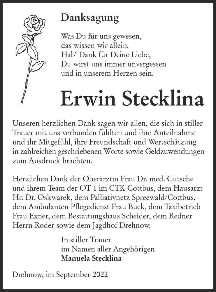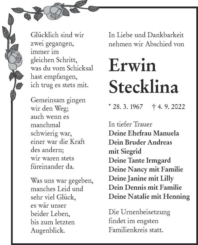 Hier finden Sie alle Traueranzeigen aus der Zeitung, die bisher für Erwin Stecklina erschienen sind. Weitere Traueranzeigen, die in der Zeitung erscheinen, werden hier ebenfalls aufgelistet