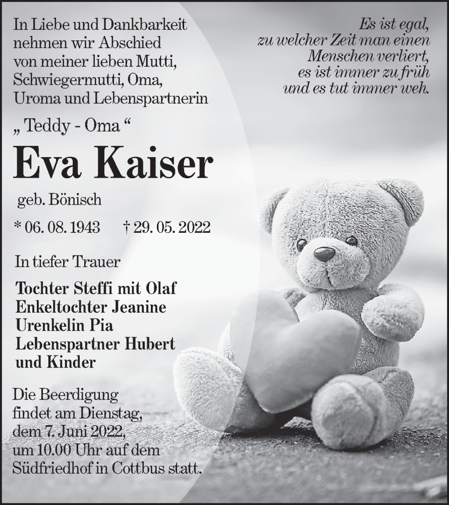 Hier finden Sie alle Traueranzeigen aus der Zeitung, die bisher für Eva Kaiser erschienen sind. Weitere Traueranzeigen, die in der Zeitung erscheinen, werden hier ebenfalls aufgelistet