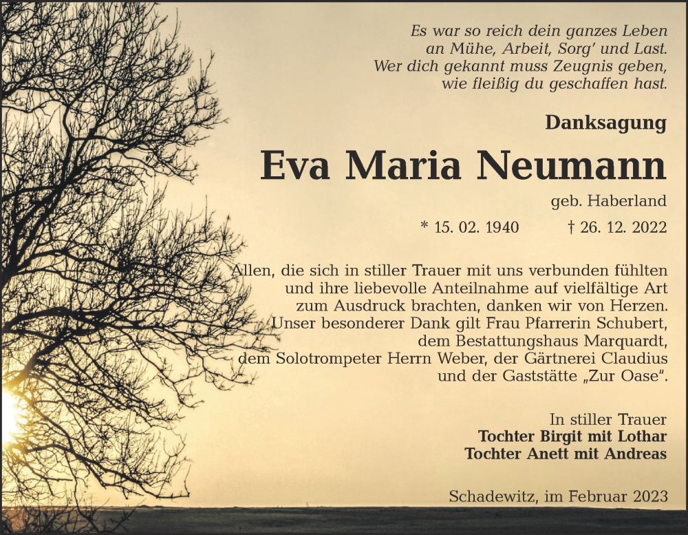 Hier finden Sie alle Traueranzeigen aus der Zeitung, die bisher für Eva Maria Neumann erschienen sind. Weitere Traueranzeigen, die in der Zeitung erscheinen, werden hier ebenfalls aufgelistet