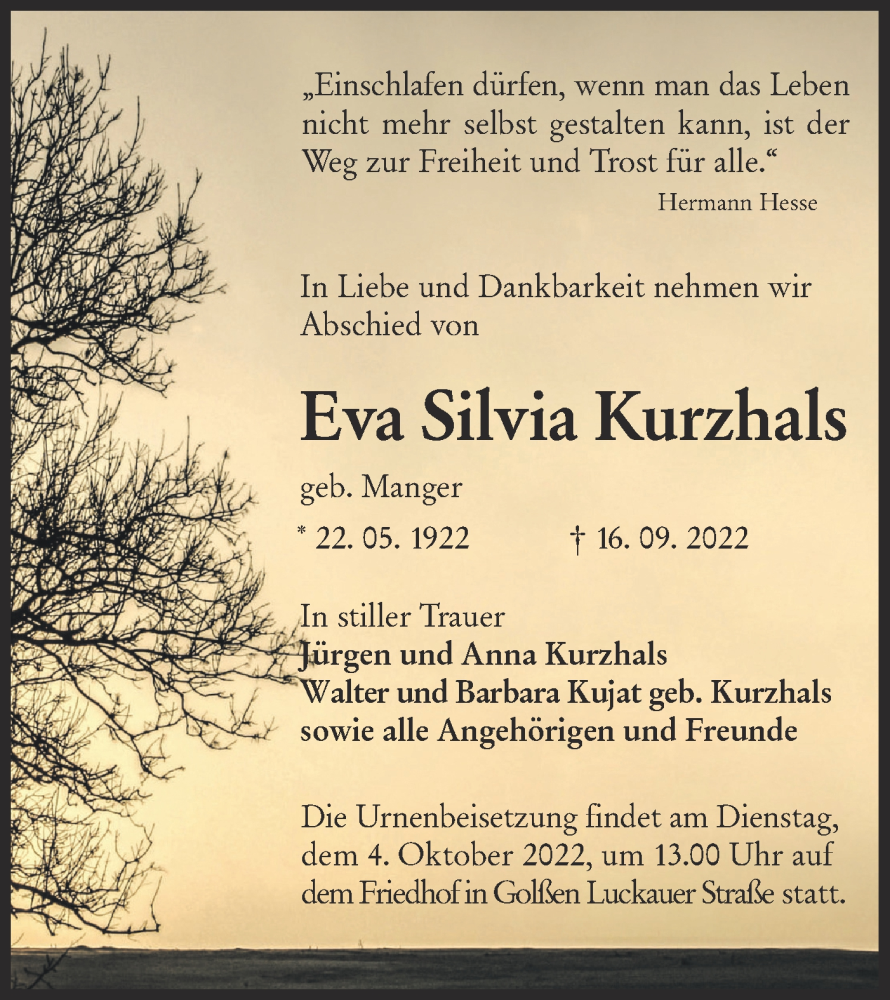 Hier finden Sie alle Traueranzeigen aus der Zeitung, die bisher für Eva Silvia Kurzhals erschienen sind. Weitere Traueranzeigen, die in der Zeitung erscheinen, werden hier ebenfalls aufgelistet