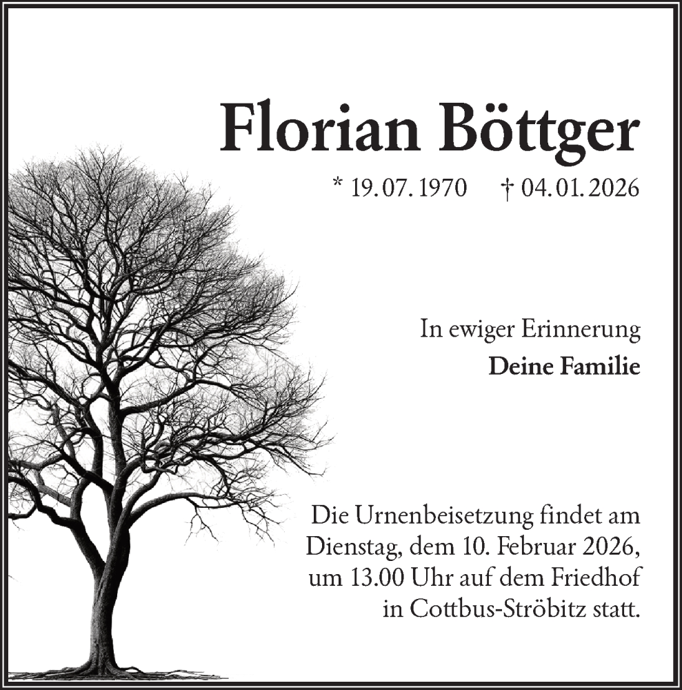 Hier finden Sie alle Traueranzeigen aus der Zeitung, die bisher für Florian Böttger erschienen sind. Weitere Traueranzeigen, die in der Zeitung erscheinen, werden hier ebenfalls aufgelistet