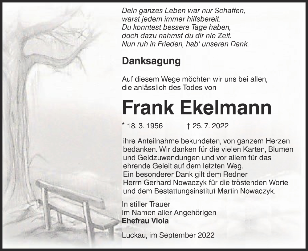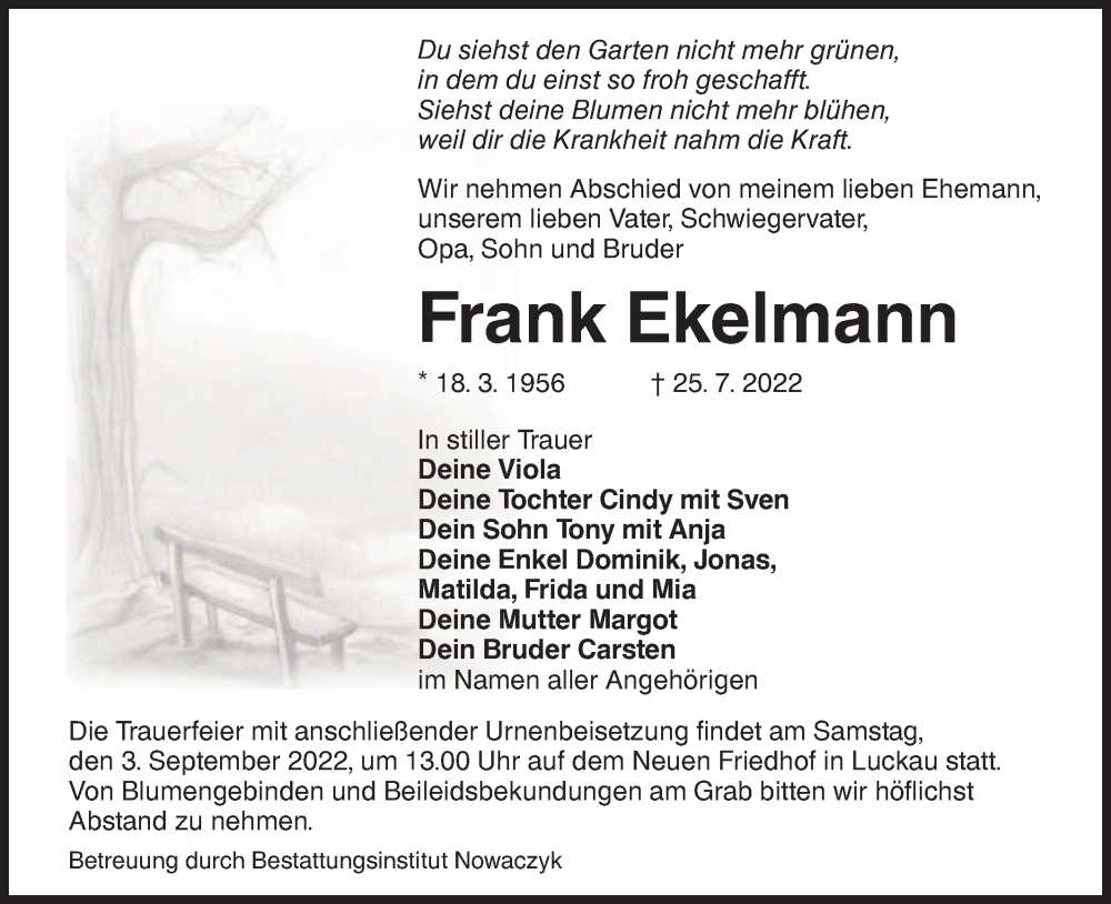 Hier finden Sie alle Traueranzeigen aus der Zeitung, die bisher für Frank Ekelmann erschienen sind. Weitere Traueranzeigen, die in der Zeitung erscheinen, werden hier ebenfalls aufgelistet