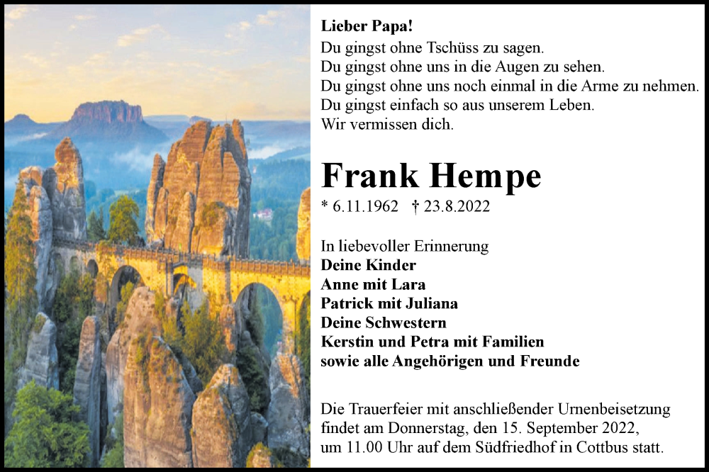 Hier finden Sie alle Traueranzeigen aus der Zeitung, die bisher für Frank Hempe erschienen sind. Weitere Traueranzeigen, die in der Zeitung erscheinen, werden hier ebenfalls aufgelistet