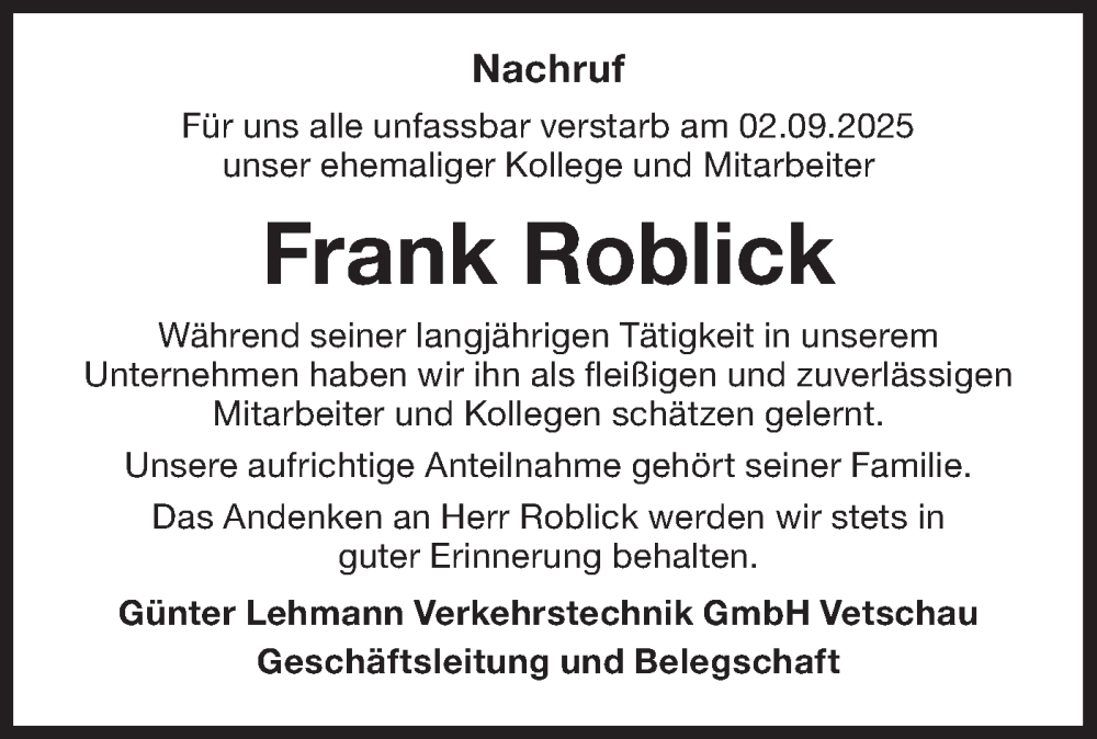 Hier finden Sie alle Traueranzeigen aus der Zeitung, die bisher für Frank Roblick erschienen sind. Weitere Traueranzeigen, die in der Zeitung erscheinen, werden hier ebenfalls aufgelistet