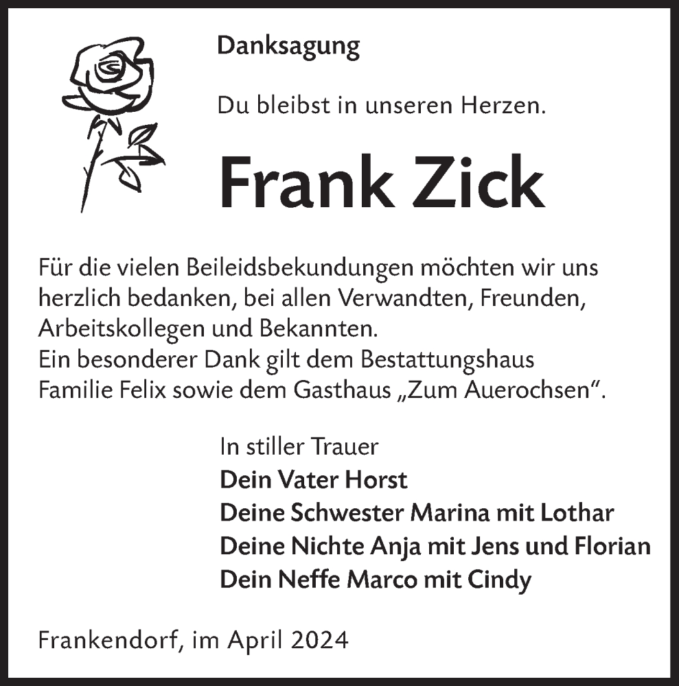 Hier finden Sie alle Traueranzeigen aus der Zeitung, die bisher für Frank Zick erschienen sind. Weitere Traueranzeigen, die in der Zeitung erscheinen, werden hier ebenfalls aufgelistet