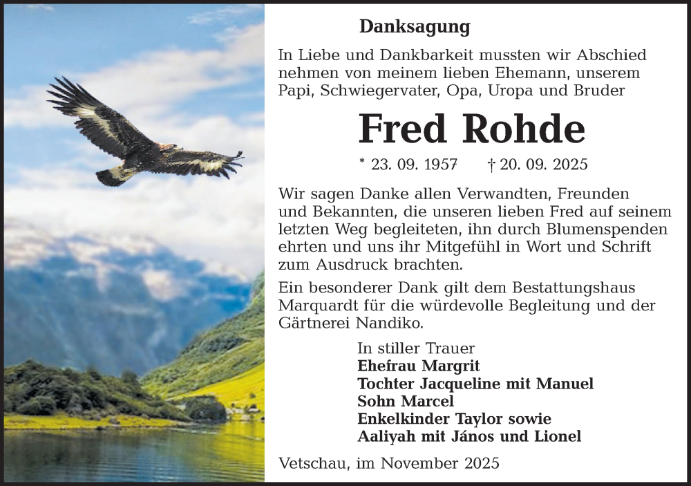 Hier finden Sie alle Traueranzeigen aus der Zeitung, die bisher für Fred Rohde erschienen sind. Weitere Traueranzeigen, die in der Zeitung erscheinen, werden hier ebenfalls aufgelistet