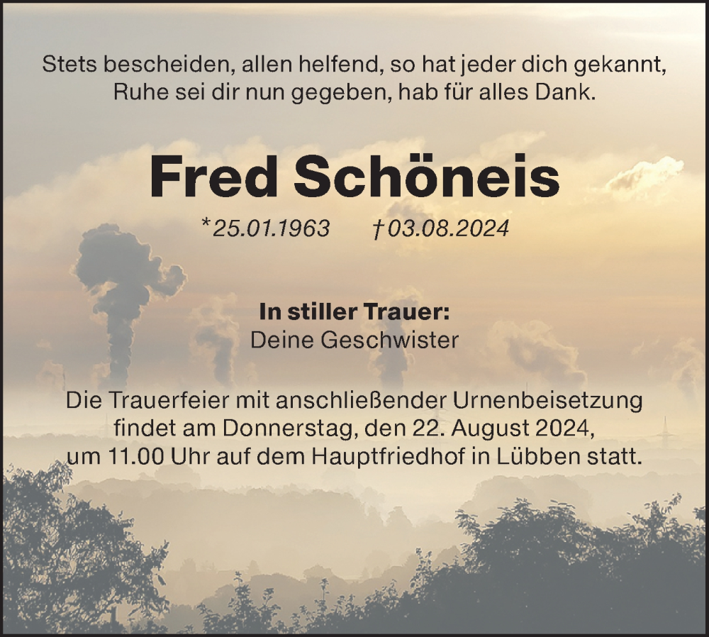 Hier finden Sie alle Traueranzeigen aus der Zeitung, die bisher für Fred Schöneis erschienen sind. Weitere Traueranzeigen, die in der Zeitung erscheinen, werden hier ebenfalls aufgelistet