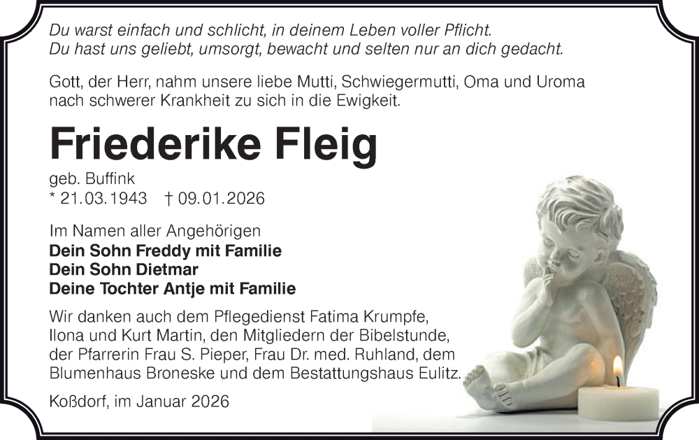 Hier finden Sie alle Traueranzeigen aus der Zeitung, die bisher für Friederike Fleig erschienen sind. Weitere Traueranzeigen, die in der Zeitung erscheinen, werden hier ebenfalls aufgelistet