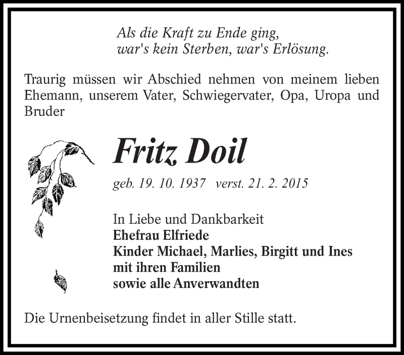 Hier finden Sie alle Traueranzeigen aus der Zeitung, die bisher für Fritz Doil erschienen sind. Weitere Traueranzeigen, die in der Zeitung erscheinen, werden hier ebenfalls aufgelistet