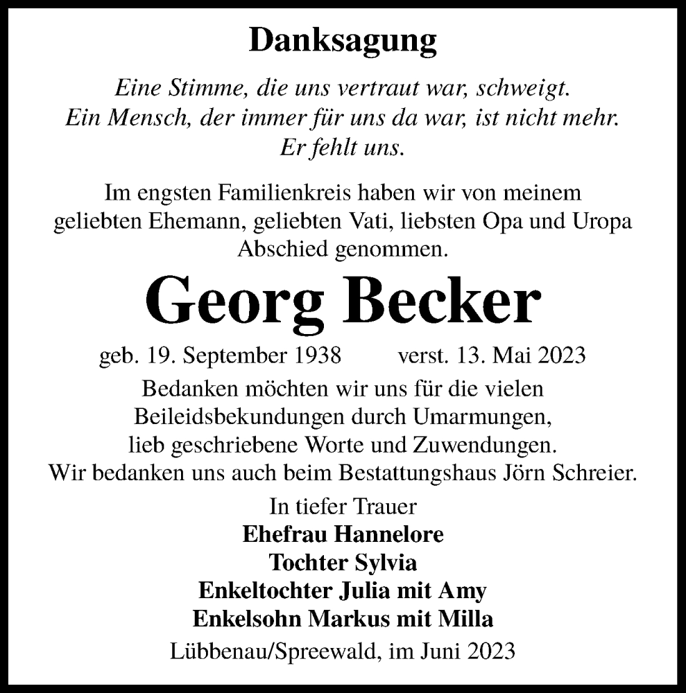 Hier finden Sie alle Traueranzeigen aus der Zeitung, die bisher für Georg Becker erschienen sind. Weitere Traueranzeigen, die in der Zeitung erscheinen, werden hier ebenfalls aufgelistet