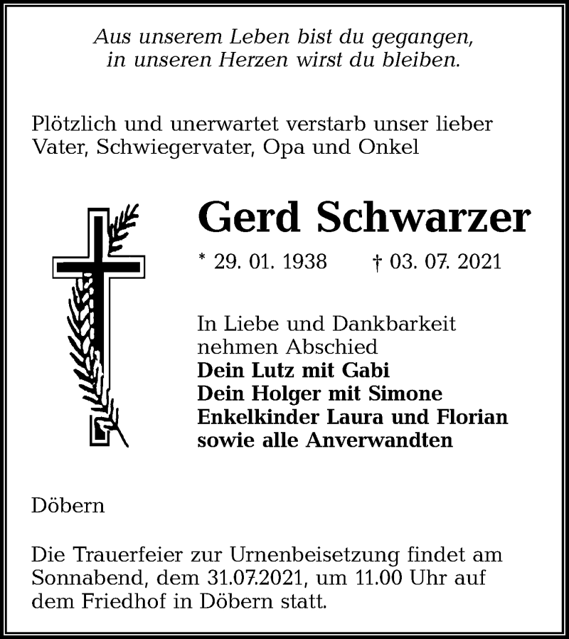 Hier finden Sie alle Traueranzeigen aus der Zeitung, die bisher für Gerd Schwarzer erschienen sind. Weitere Traueranzeigen, die in der Zeitung erscheinen, werden hier ebenfalls aufgelistet