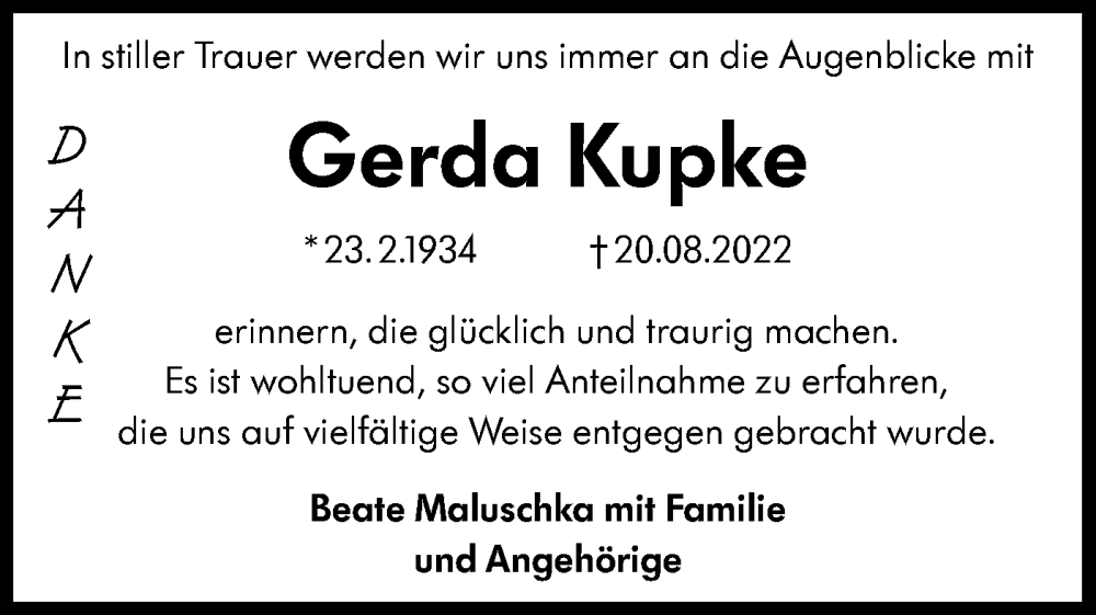 Hier finden Sie alle Traueranzeigen aus der Zeitung, die bisher für Gerda Kupke erschienen sind. Weitere Traueranzeigen, die in der Zeitung erscheinen, werden hier ebenfalls aufgelistet