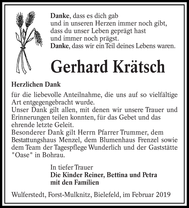 Hier finden Sie alle Traueranzeigen aus der Zeitung, die bisher für Gerhard Krätsch erschienen sind. Weitere Traueranzeigen, die in der Zeitung erscheinen, werden hier ebenfalls aufgelistet