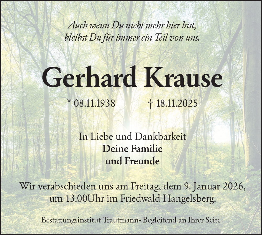 Hier finden Sie alle Traueranzeigen aus der Zeitung, die bisher für Gerhard Krause erschienen sind. Weitere Traueranzeigen, die in der Zeitung erscheinen, werden hier ebenfalls aufgelistet