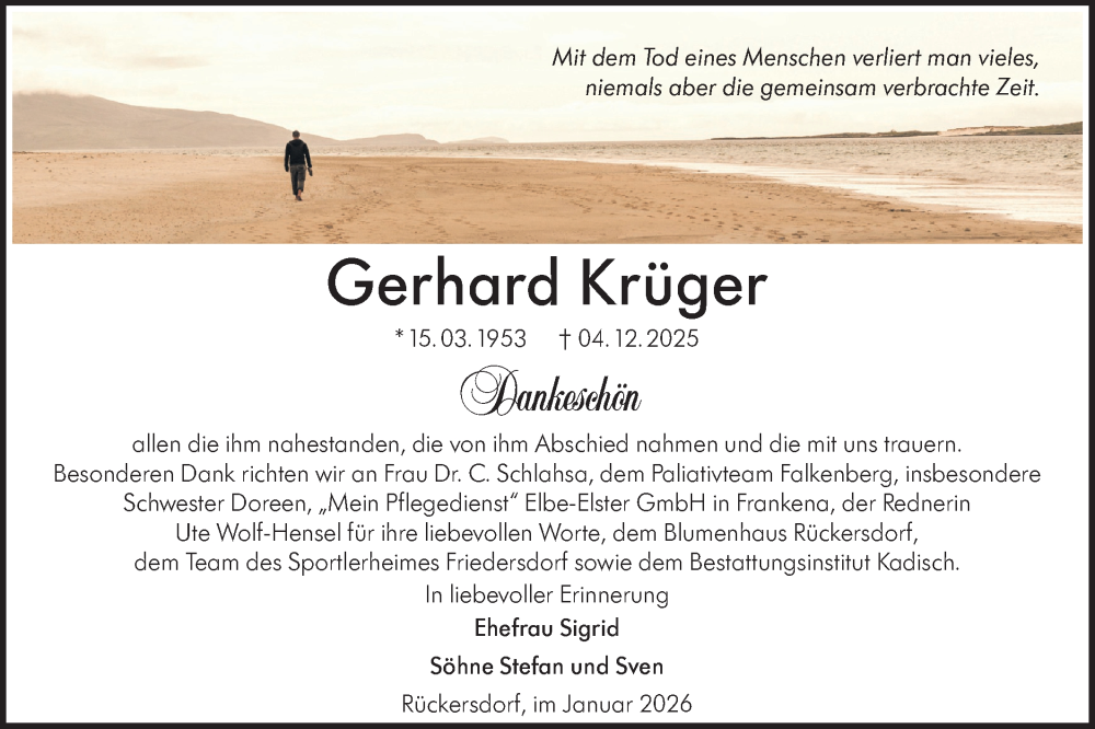 Hier finden Sie alle Traueranzeigen aus der Zeitung, die bisher für Gerhard Krüger erschienen sind. Weitere Traueranzeigen, die in der Zeitung erscheinen, werden hier ebenfalls aufgelistet