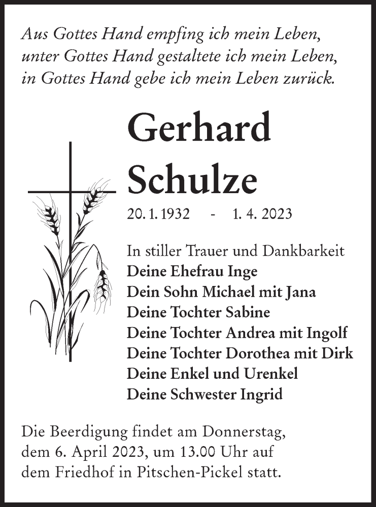 Hier finden Sie alle Traueranzeigen aus der Zeitung, die bisher für Gerhard Schulze erschienen sind. Weitere Traueranzeigen, die in der Zeitung erscheinen, werden hier ebenfalls aufgelistet