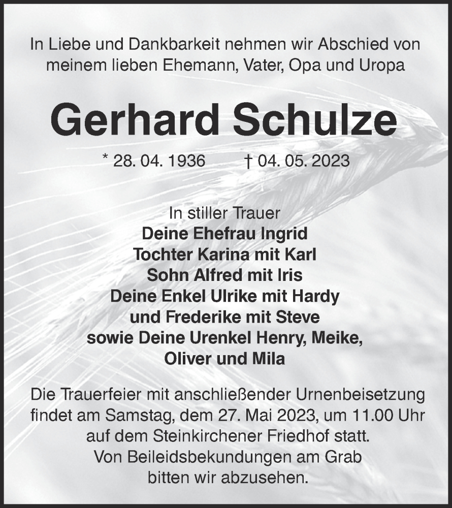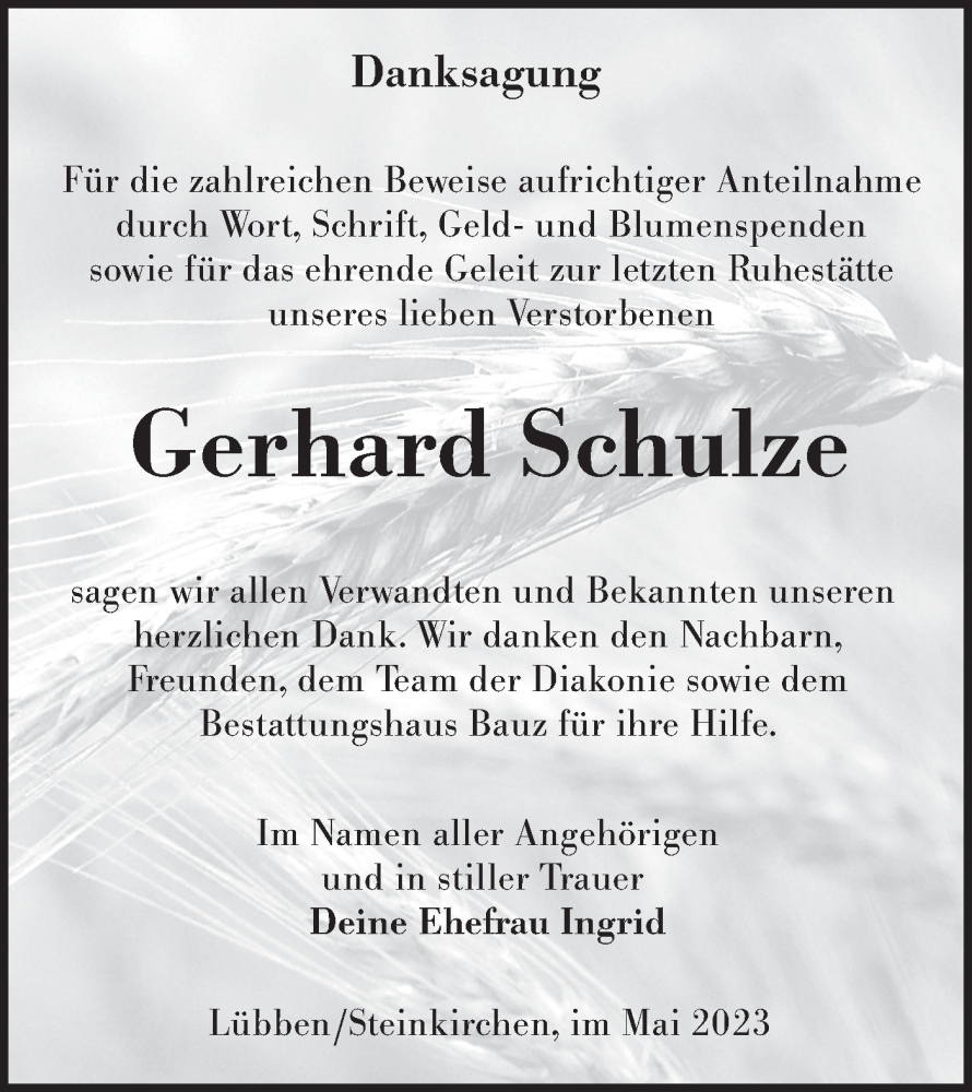 Hier finden Sie alle Traueranzeigen aus der Zeitung, die bisher für Gerhard Schulze erschienen sind. Weitere Traueranzeigen, die in der Zeitung erscheinen, werden hier ebenfalls aufgelistet