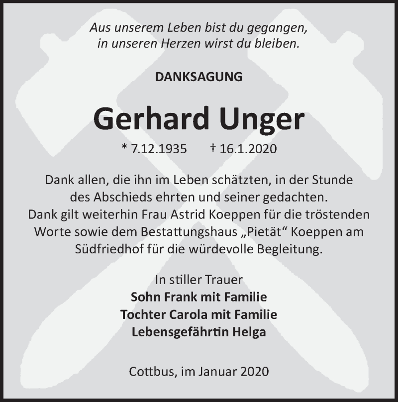 Hier finden Sie alle Traueranzeigen aus der Zeitung, die bisher für Gerhard Unger erschienen sind. Weitere Traueranzeigen, die in der Zeitung erscheinen, werden hier ebenfalls aufgelistet