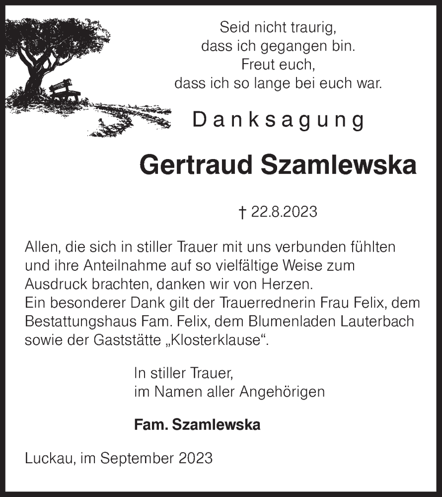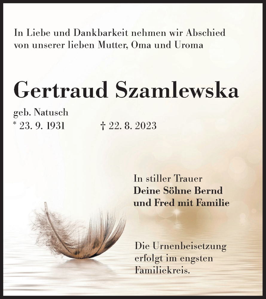 Hier finden Sie alle Traueranzeigen aus der Zeitung, die bisher für Gertraud Szamlewska erschienen sind. Weitere Traueranzeigen, die in der Zeitung erscheinen, werden hier ebenfalls aufgelistet
